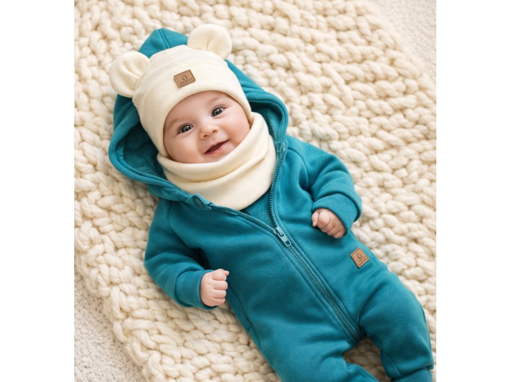 Soupravu tvoří zateplený overal z mimořádně měkkého materiálu, ideální do chladnějších dnů, a jemný set čepičky s nákrčníkem z pružného úpletu, který krásně sedí, nikde netlačí a spolehlivě chrání před zimou.
