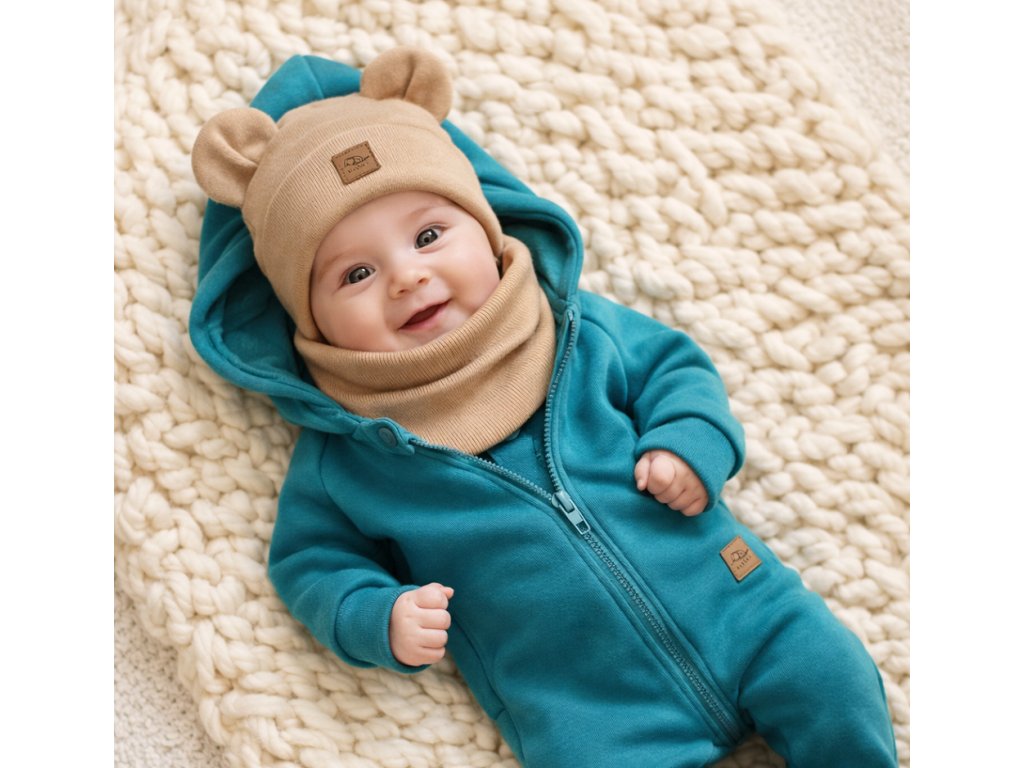 Soupravu tvoří zateplený overal z mimořádně měkkého materiálu, ideální do chladnějších dnů, a jemný set čepičky s nákrčníkem z pružného úpletu, který krásně sedí, nikde netlačí a spolehlivě chrání před zimou.