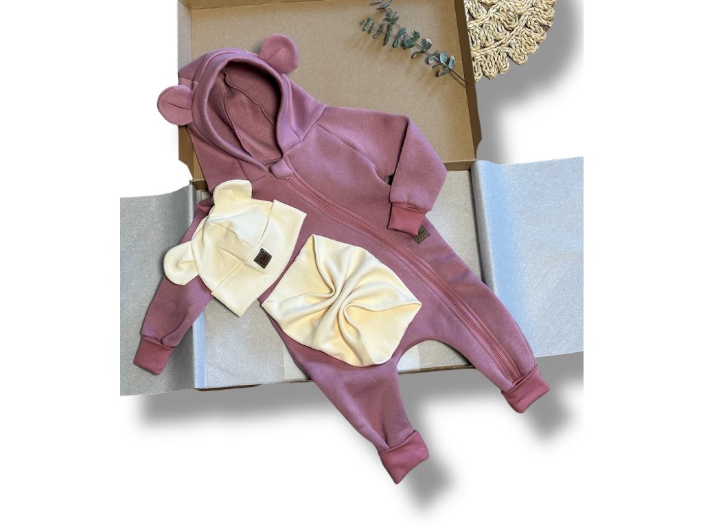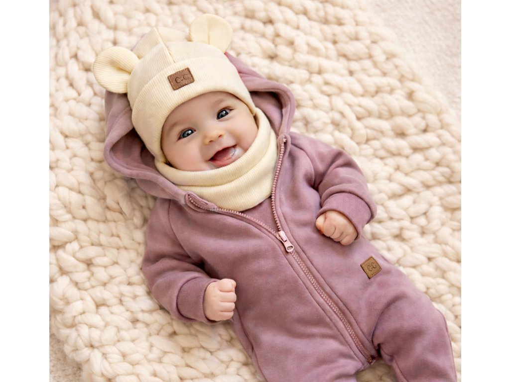 Soupravu tvoří zateplený overal z mimořádně měkkého materiálu, ideální do chladnějších dnů, a jemný set čepičky s nákrčníkem z pružného úpletu, který krásně sedí, nikde netlačí a spolehlivě chrání před zimou.