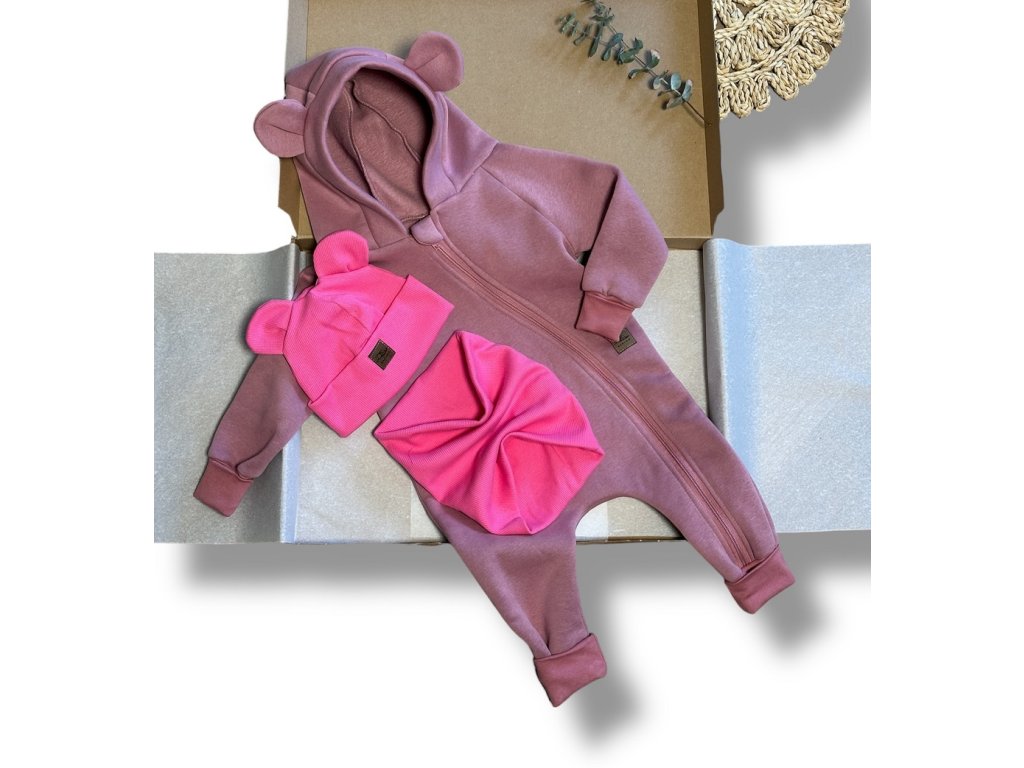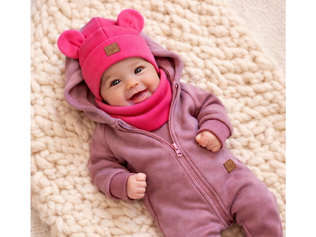Soupravu tvoří zateplený overal z mimořádně měkkého materiálu, ideální do chladnějších dnů, a jemný set čepičky s nákrčníkem z pružného úpletu, který krásně sedí, nikde netlačí a spolehlivě chrání před zimou.