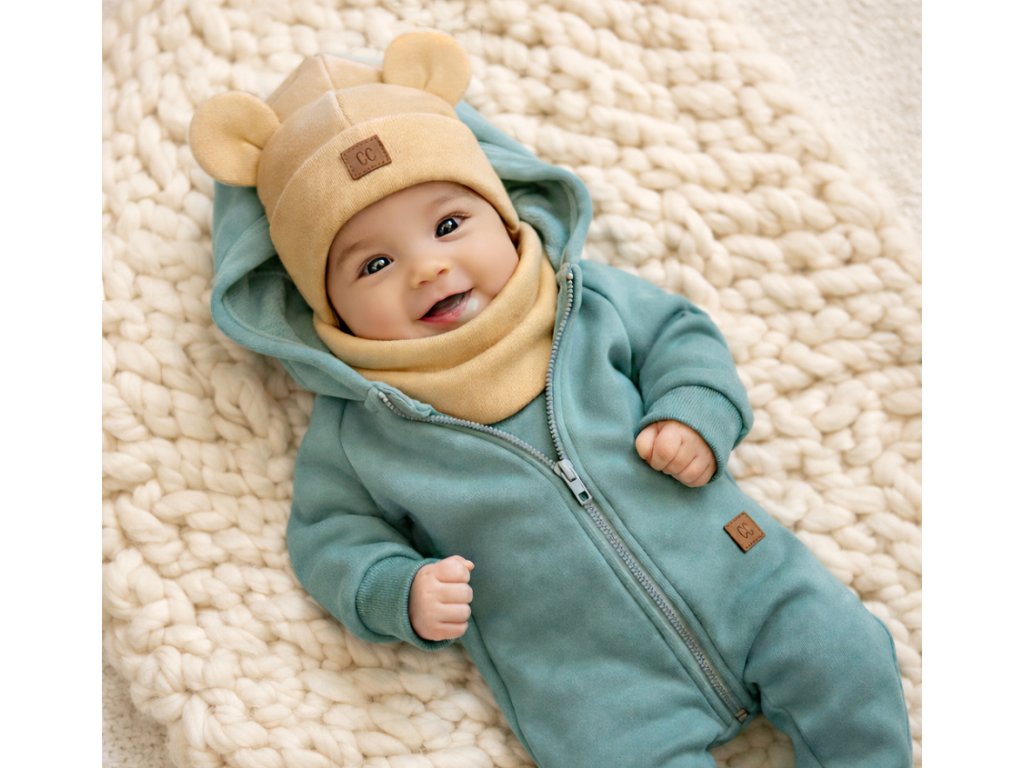 Soupravu tvoří zateplený overal z mimořádně měkkého materiálu, ideální do chladnějších dnů, a jemný set čepičky s nákrčníkem z pružného úpletu, který krásně sedí, nikde netlačí a spolehlivě chrání před zimou.