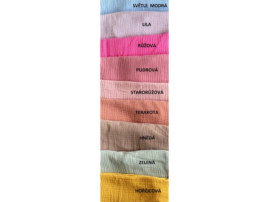 Bavlněný mušelín, známý také jako dvojitá gázovina je jemně tkaný prodyšný materiál mačkaného vzhledu. Tento materiál má perfektní vlastnosti v letním období, saje pot a propouští vzduch. Látka je certifikovaná OKO-TEX standart 100, tudíž je zdravotně nezávadná pro děti do 3 let.