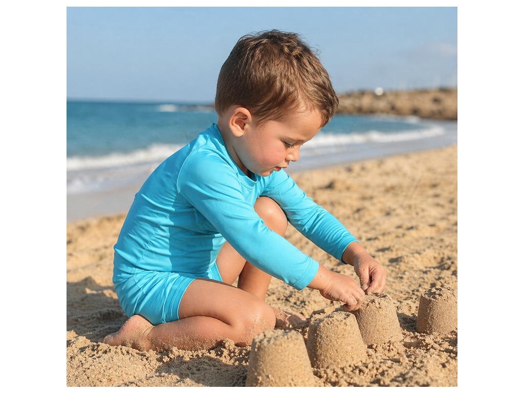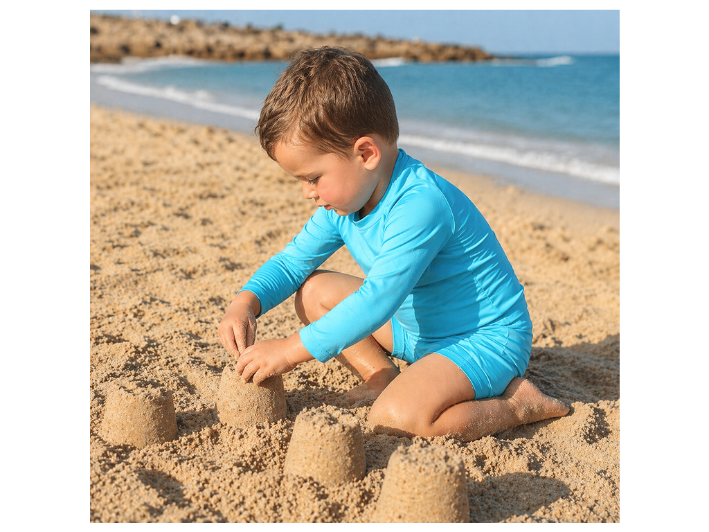 Díky vysoké elasticitě a lehkosti látky se oblečení perfektně přizpůsobí každému pohybu – ať už dítě skáče do vln, honí balón po pláži nebo staví hrady z písku.