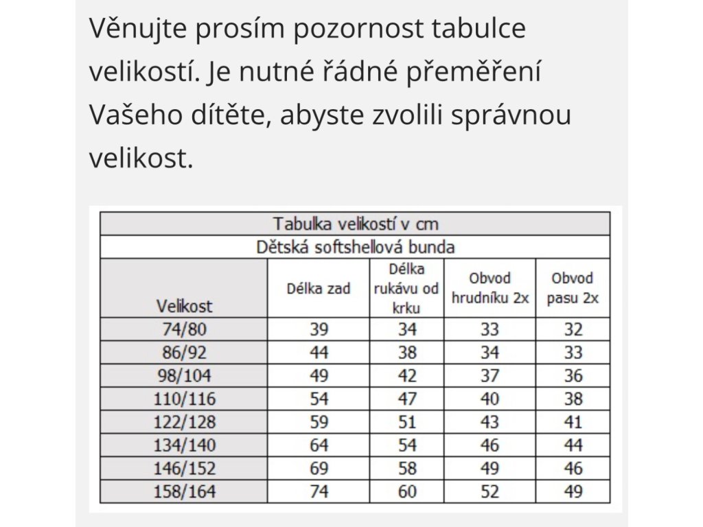 | Velikost - rostoucí bundy a kalhoty: | 74-80, 86-92, 98-104, 110-116, 122-128, 134-140, 146-152 |