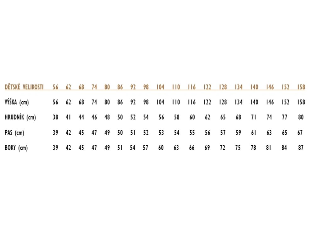 | Velikost - parky: | 80, 86, 92, 98, 104, 110, 116, 122, 128, 134, 140, 146, 152 |