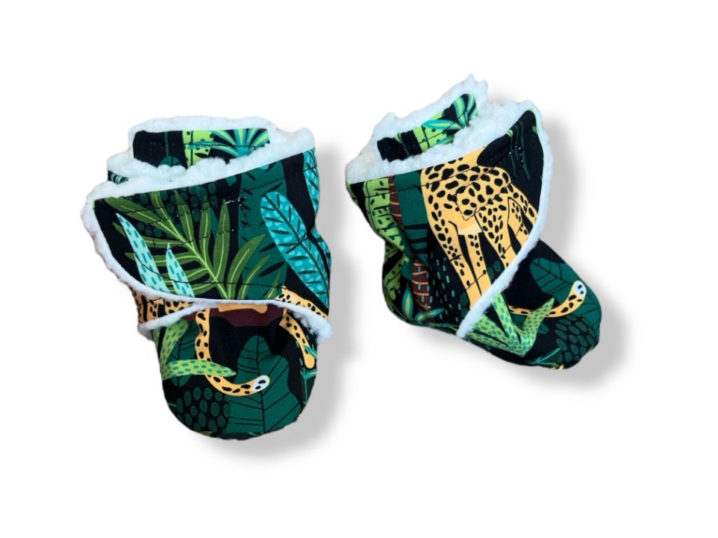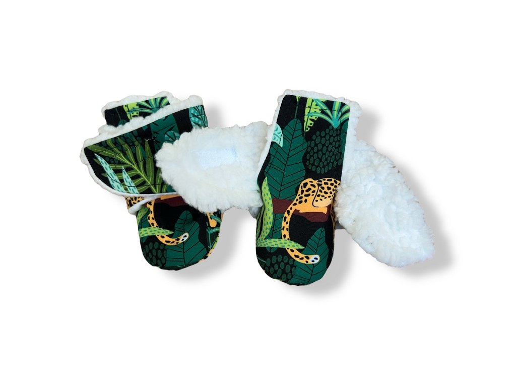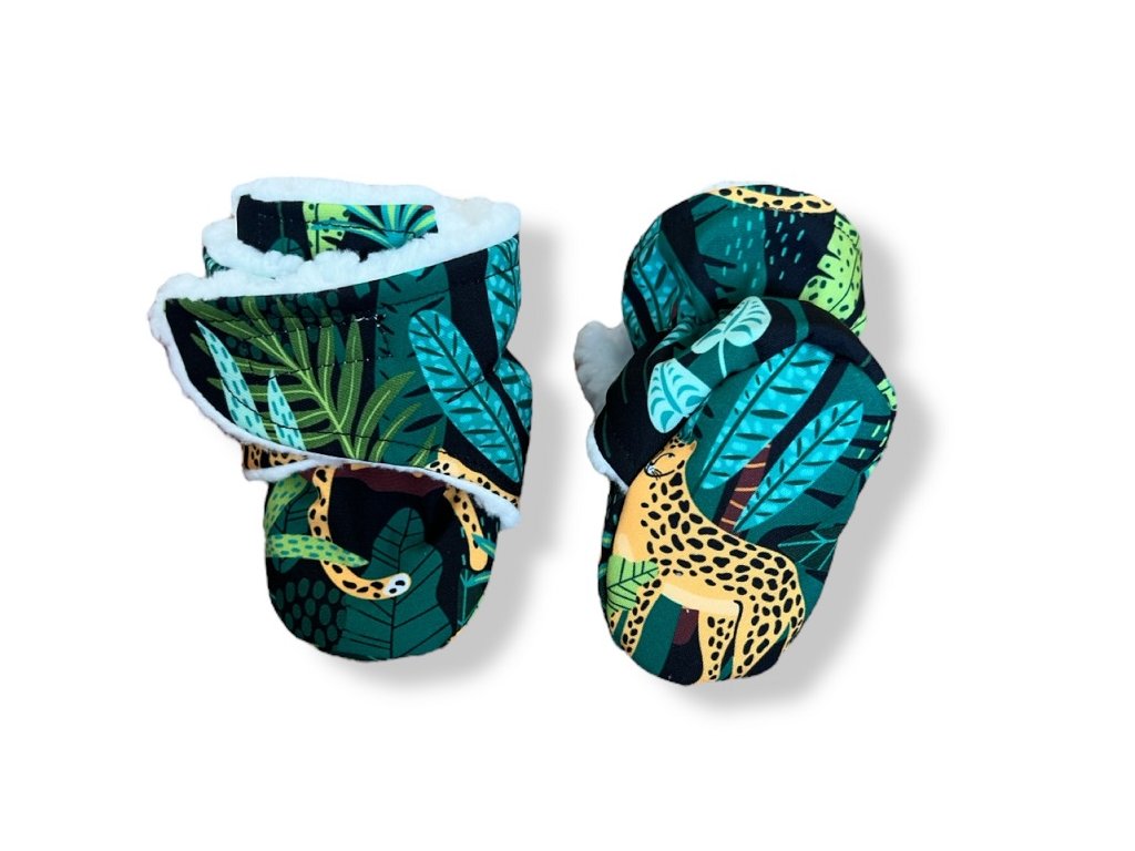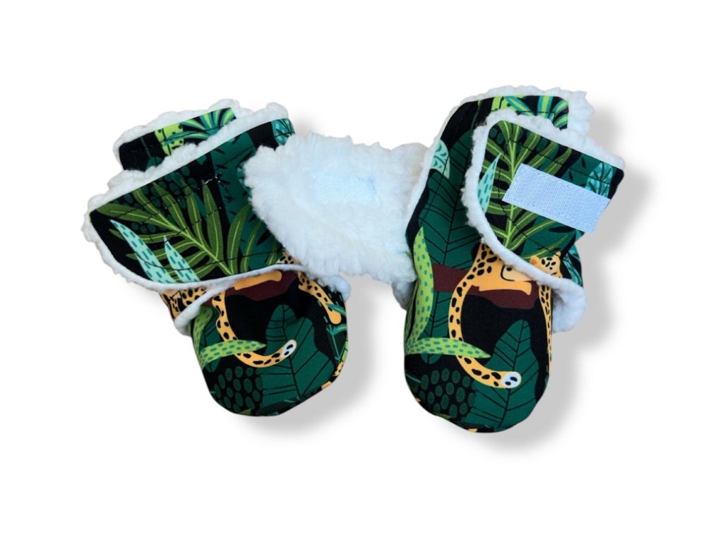 Tyto capáčky jsou ideální volbou pro chladné dny – ať už vyrážíte na procházku s kočárkem nebo nosítkem. Jsou ušité z odolného nepromokavého softshellu s vodním sloupcem 10 000 mm a navíc podšité extra hřejivým a měkkoučkým beránkem, který spolehlivě udrží dětské nožičky ky v teple i při chladném počasí.