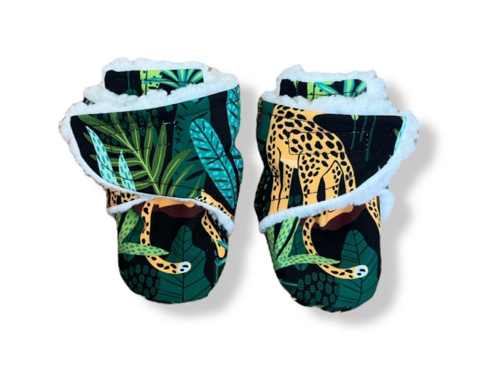Praktické zapínání na suchý zip a všitá gumička zajistí, že capáčky perfektně sedí, nekloužou a neomezují v pohybu – skvěle drží jak v nosítku, tak i při odpočinku v kočárku.