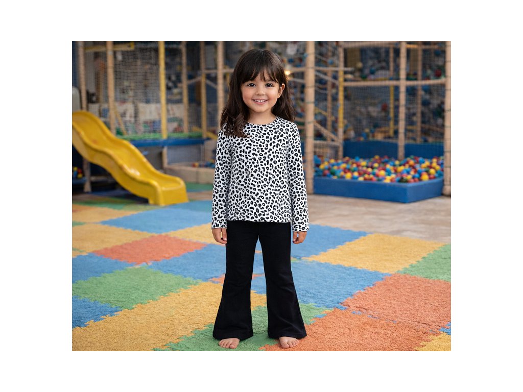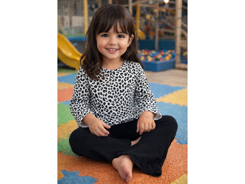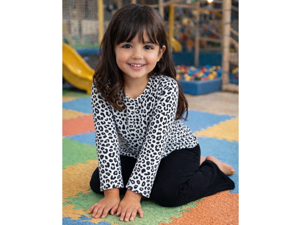 Elegantní černobílý leopardí motiv dodává tričku moderní, nadčasový vzhled s jemným nádechem hravosti. Univerzální střih z něj dělá praktický kousek pro každý den — skvěle se kombinuje s legínami na doma i s rifličkami do školky.